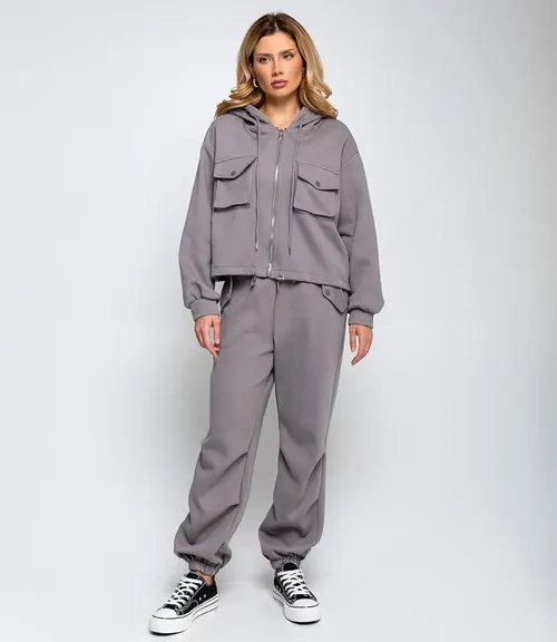 Спортивный костюм с укороченной толстовкой и брюками. Манжеты на руках будут делать носку более комфортной, а резинка на талии может уменьшаться под ваш комфортный размер. Такие же мягкие брюки с карманами свободного кроя будут комфортно ощущаться и не терять форму благодаря плотной ткани. Карманы как на толстовке, так и на брюках могут хранить ваши личные вещи. Параметры модели: рост 173, 84-58-89.