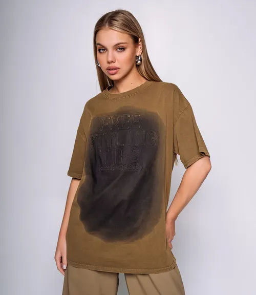 Удлиненная футболка с эффектом обугливания - это модная и стильная модель, которая добавит небрежности и интересных деталей в ваш образ. Футболка имеет надпись спереди. Эффект обугливания дает футболке изношенный вид, сделанный специально, чтобы выглядеть стильно и неординарно. Удлиненный фасон футболки позволяет носить ее как отдельную вещь, так и сочетать с другими элементами гардероба, например, с джинсами или леггинсами. Вы можете создавать разнообразные образы, дополняя футболку аксессуарами, такими как шапки, сумки или ювелирные изделия. Рост модели 170 см., 86-68-95.