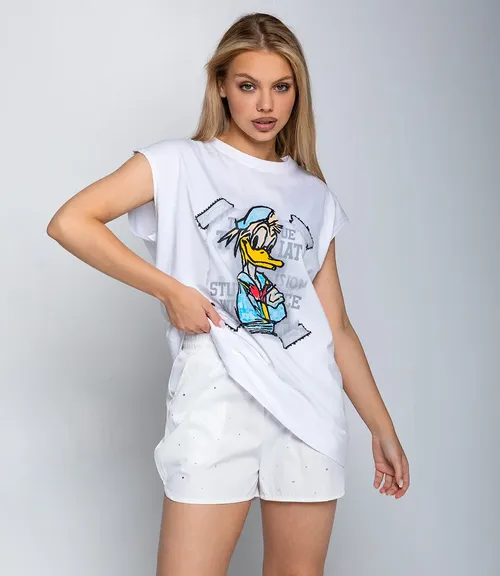 Майка – это вещь, которая выделяет уникальность каждой представительницы прекрасного пола. Данная модель майки для летнего сезона изготовлена из ткани с составом 90% хлопок, 10% полиэстер. На майке присутствует яркий принт с мультипликационным персонажем. Производитель знает, как находить уникальные и стильные решения. Ткань, использованная для изготовления майки, характеризуется отличным качеством. Даже после многих стирок майка сохранит свою привлекательность. Вы будете носить ее с удовольствием. Обратите внимание на яркий принт. Чтобы убедиться в правильном размере, воспользуйтесь таблицей на сайте. Предложенная цена является приемлемой. Не упустите шанс быть неповторимой!