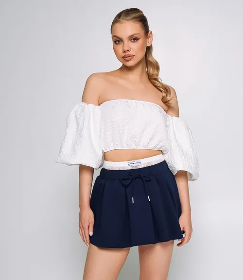 Юбка выполнена из ткани, состоящей из 85% хлопка и 15% полиэстера, что придаёт изделию мягкость и натуральность хлопка с добавлением прочности и легкой эластичности за счет полиэстера. Юбка свободно расширяется книзу. Талия оформлена широкой, эластичной резинкой с внутренним широким вставным поясом из прозрачного материала с декоративным узором, что обеспечивает удобство посадки по фигуре и добавляет необычный дизайнерский акцент. Спереди находится шнурок, оформленный в форме завязок, позволяющий дополнительно регулировать посадку на талии и служащий стильным декоративным элементом. Концы шнурка дополнены металлическими наконечниками для придания аккуратного вида. Ткань хорошо драпируется и сохраняет форму, благодаря плотной структуре и высокому содержанию хлопка. Длина юбки короткая, акцентирующая ноги и создающая свежий, молодежный, и в то же время комфортный образ. Такая юбка отлично подходит для повседневной носки и может объединяться с различными верхами и обувью, создавая стильные и удобные комплекты. Рост 168 см, 89-63-90.