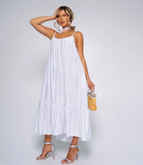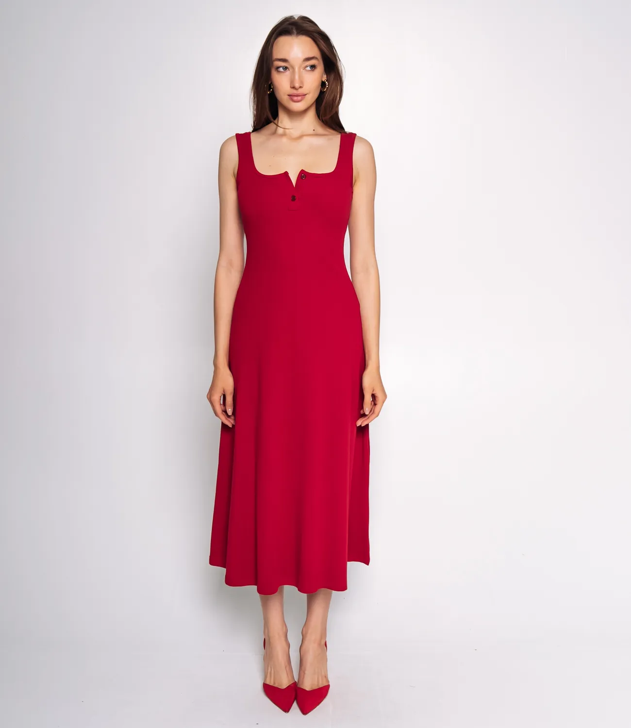 Платье выполнено из 65% хлопка, 30% полиэстера и 5% эластана, что придает ткани легкость, воздушность и приятное шелковистое ощущение при соприкосновении с кожей. Это трикотажное платье длины миди, имеющее слегка приталенный силуэт. У платья прямой, квадратный вырез горловины и широкие бретели, полностью закрывающие плечи. Платье плотно облегает фигуру в области груди и талии, а затем плавно расширяется книзу, создавая мягкий А-образный силуэт. Отсутствие рукавов и простота дизайна делают это платье отличным выбором для теплой погоды или в качестве базового элемента гардероба, который можно легко комбинировать с другими предметами одежды и аксессуарами. Рост 168 см, 85-63-92