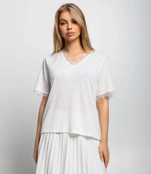 Футболка выполнена из ткани, состоящей на 80% из хлопка и на 20% из полиэстера. Такое сочетание материалов обеспечивает оптимальный баланс комфорта и практичности. Модель имеет свободный крой с короткими рукавами и V-образным вырезом, украшенным деликатной кружевной отделкой, что придаёт изделию элегантность и женственность. Кружево также присутствует на краях рукавов, добавляя лёгкость и изысканный акцент. Ткань средней плотности обеспечивает хорошую посадку и комфорт при движении, а структура материала сочетает в себе долговечность синтетики и натуральную свежесть хлопка.. Чтобы вы были уверены в размере, мы представили на странице таблицу. Воспользовавшись ею, вы сможете сами сделать мерки и удостовериться. Предложенная нами цена является приемлемой. Не откажите себе в удовольствии быть элегантной. Рост модели 168см., 89-53-90.
