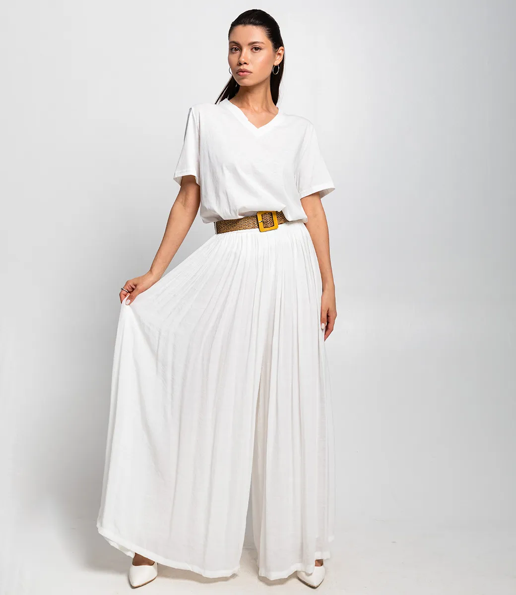 Брюки – это незаменимая часть гардероба, которая подчеркивает женственность и уникальность каждой представительницы прекрасного пола. Эти брюки выполнены из 100% полиэстера, что обеспечивает им легкость, долговечность и хорошую износостойкость. Модель отличается свободным кроем с широкими штанинами, создающими эффект плиссировки за счет мелких, равномерных складок по всей длине изделия. Высокая посадка подчёркивается поясом с декоративной пряжкой, который акцентирует талию. Для удобства мы предоставили таблицу размеров на нашем сайте, чтобы ваши покупатели могли точно подобрать подходящий размер. Предложенная нами цена является доступной и выгодной для оптовых покупателей, что делает эти брюки отличным дополнением к ассортименту вашего магазина. Подарите своим клиентам удовольствие носить стильные и комфортные брюки, которые подойдут для любых летних дней! Рост модели 164 см., 83-61-89.